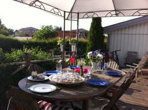 Måltiderna på vårt stora trädäck i Älta byts mot balkongvärme på sjätte våningen i en betydligt mer urban miljö med Globen utanför köksfönstret och Enskededalen på andra sidan. Men framförallt byts de mot franska diton i en lummig trädgård.