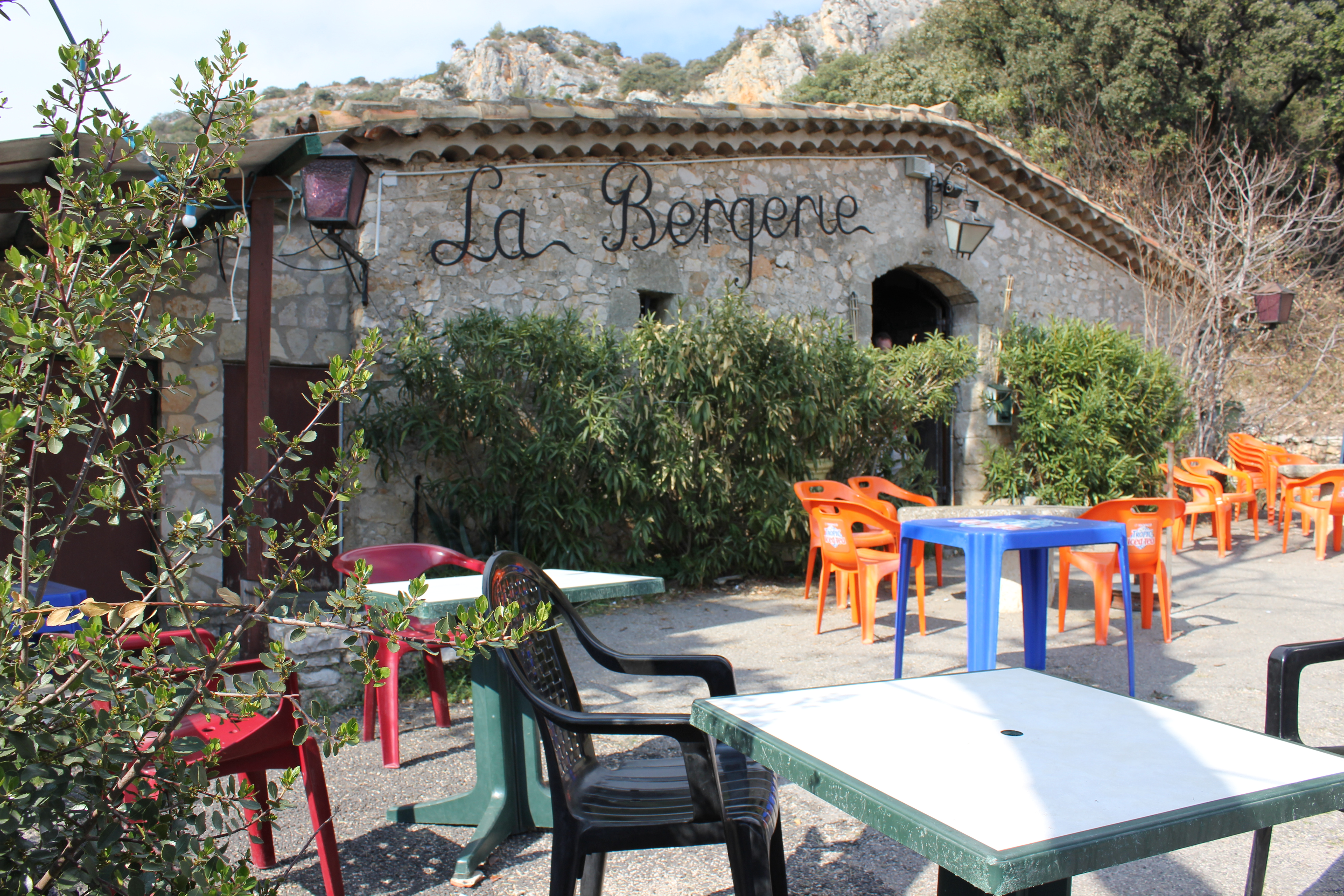 tallrikar och soppskål. Ett glas rosé blev det förstås för det krävde utsikten över den fantastiska ravinen vid bron. Ägaren till La Bergerie hade eoner av tid så här innan turistsäsongen börjat och vi hann avhandla både Palme, Castro och en hoper fotbollsspelare innan vi lämnade både honom och utsikten.