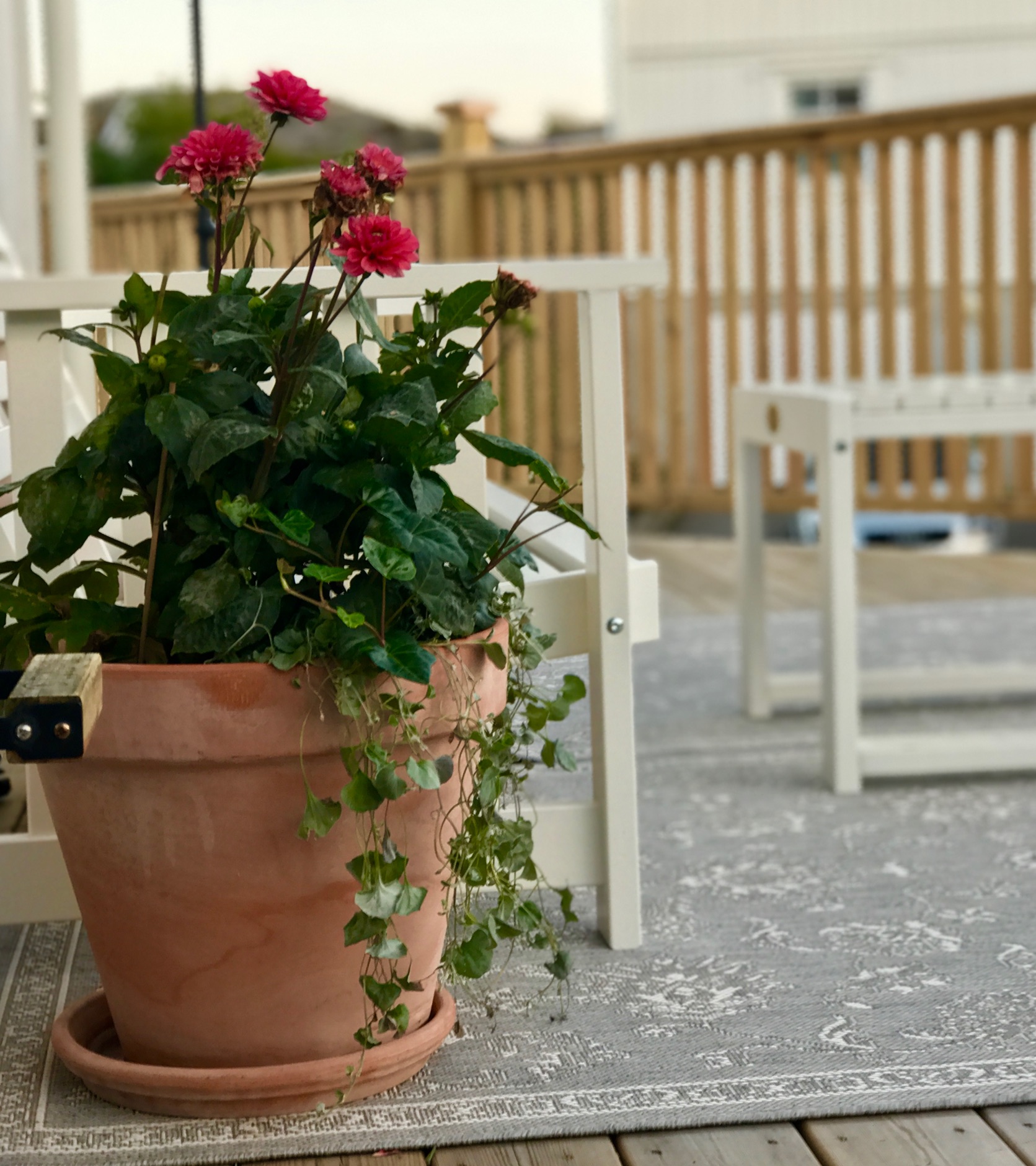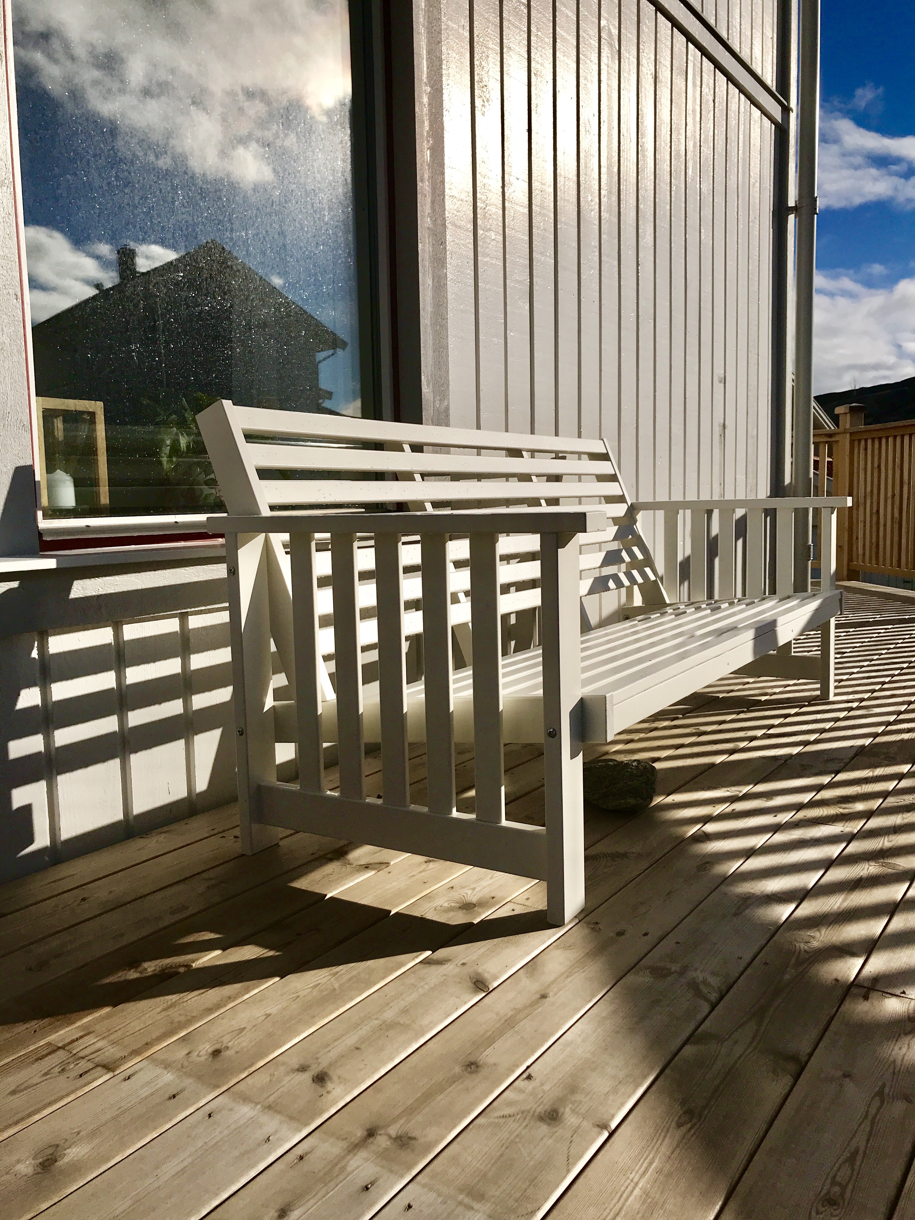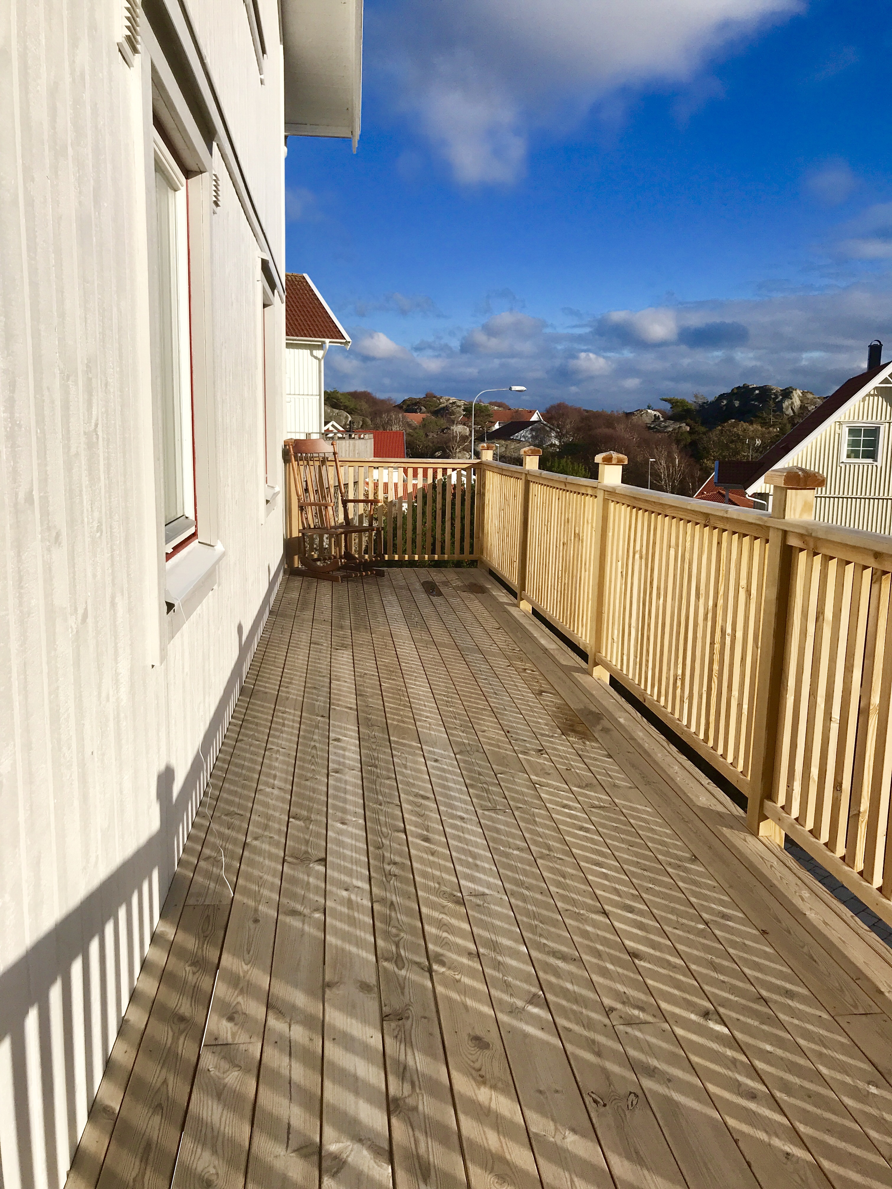 En blek höstsol, som kastar långa skuggor över en terrass förberedd för vinter,