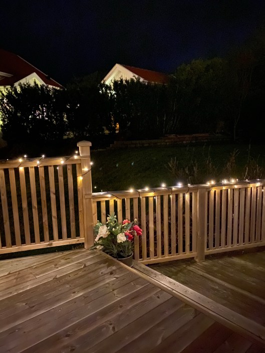 Ingen idé med sådant, har jag därför tänkt. Men i år fick det bli av! Det må ha varit grått, mörkt och regnigt den senaste tiden men det har också varit ovanligt vindstilla, så vad tusan; a woman has to live a little! Jag satsar på att stormarna håller sig borta i några veckor till och upp kommer blinget också på våra räcken.