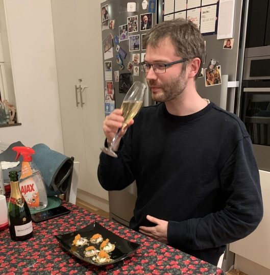 Båda två läppjar på bubblor men bara en av dem har smak på sina. De skrattar åt eländet och jag också, fastän jag annars hade kunnat vara där och hjälpa till att ta hand om både löjrom, parmesanchips och bubblor. Lillördag, ju.