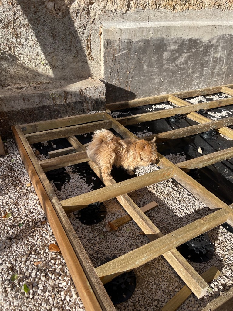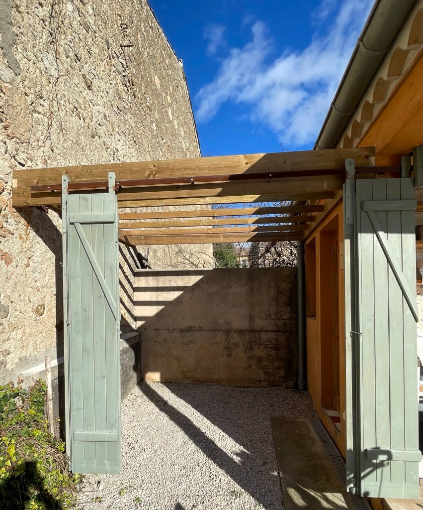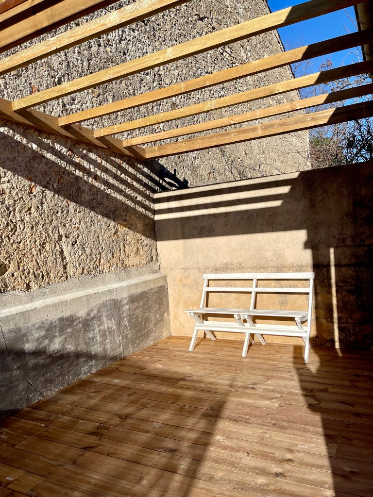Tom, som sedan under samma knappa två veckor dessutom snickrat ihop vår pergola helt enligt önskemål och lite till. Vi for tillsammans till Leroy Merlin och köpte virke och vi fanns till hands för löpande detaljbeslut men resten överlät vi med varm hand till honom.