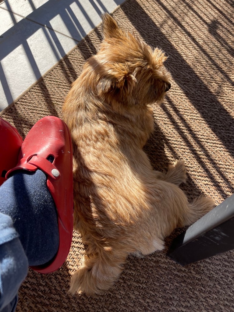 Jag sitter i solen, det är drygt 20 grader i skuggan och hunden gör mig sällskap. Vi njuter båda två.