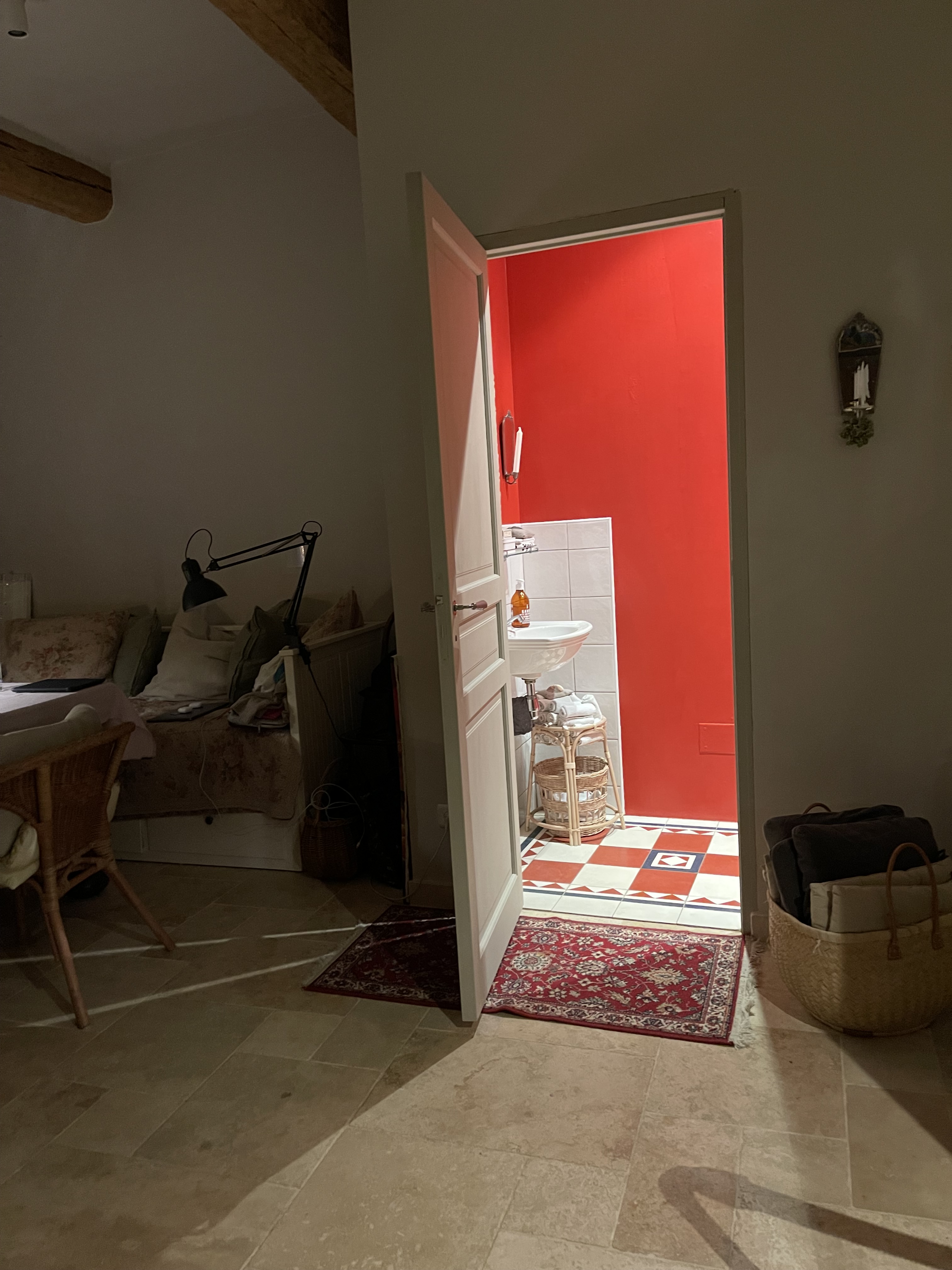 Romesco från Farrow & Ball, heter färgen, från butiken Gabanou i Boujan-sur-Libron i utkanten av Béziers. De är väldigt vänliga och hjälpsamma där, så det är dit vi far numera när färg skall införskaffas. Varför Farrow & Ball, kan man undra? Borde vi inte måla franskt och med traditionell färg? Kalkfärg, till exempel? Det är nästan alltid mitt utgångsläge att titta på det mer traditionella först. Vårt hus är gammalt och förtjänar varsamhet när det skall pysslas om. Men de tidigare ägarna for inte varsamt fram. Fönstren behölls och den gamla entrédörren men inte mycket annat. Den gamla rumsindelningen är helt borta och väggarna runt den lilla gästtoan är nya och av gips. Där finns ingenting gammalt att bevara så där blev det bra med en lättmålad färg som tål lite vattenstänk och som är lätt att torka av. Vi måste ta hänsyn till det senare, med tanke på hur många fina stora och små gäster som fyller vårt hus. De här småprojekten ger mig stor tillfredsställelse med sin överskådlighet och begränsade påverkan på livet i övrigt. De stora, omfattande renoveringarna hoppas vi slippa, åtminstone i närtid!