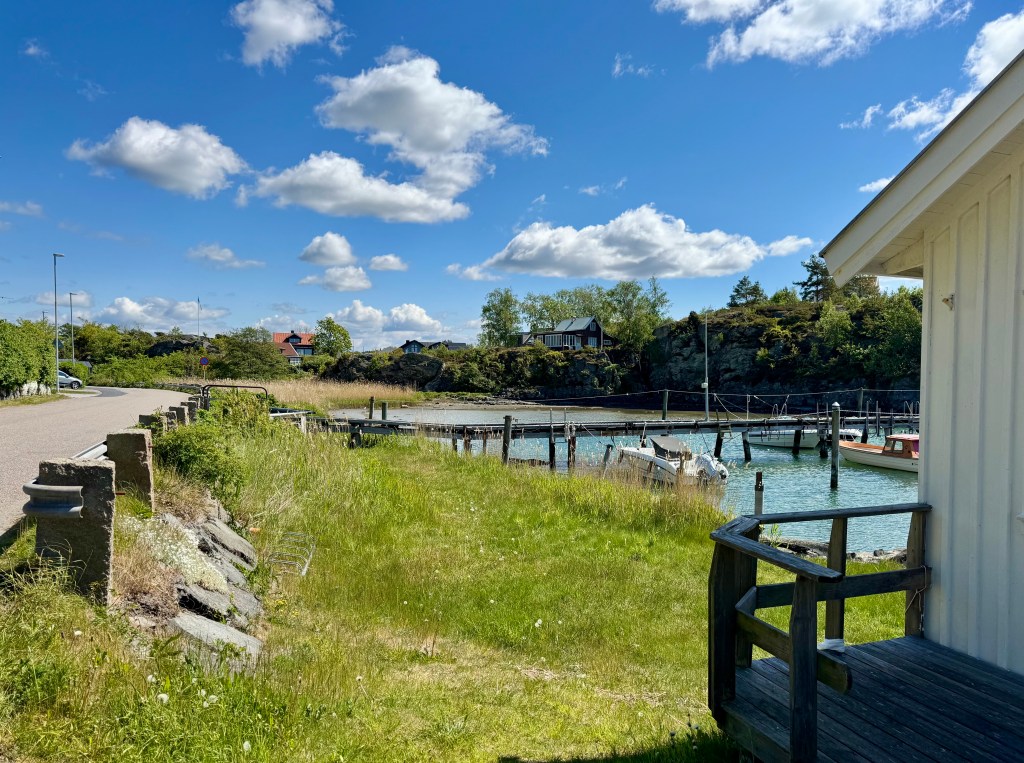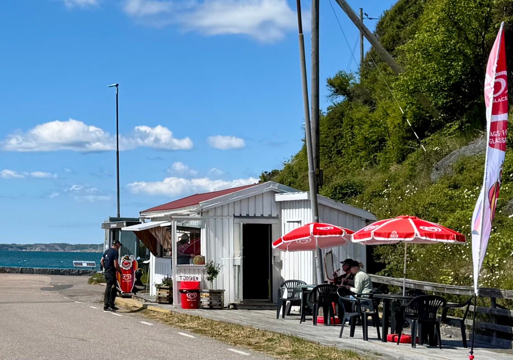 Det blåser ganska friskt men försommardagen är andlöst vacker och idag premiäröppnade lilla kjosken (sic!) nere vid småbåtshamnen, så hund och jag traskade ner, mötte glasstinna grannar på väg hem och hejade på alla vi mötte. Man gör så här. Det är nästan liksom franskt.