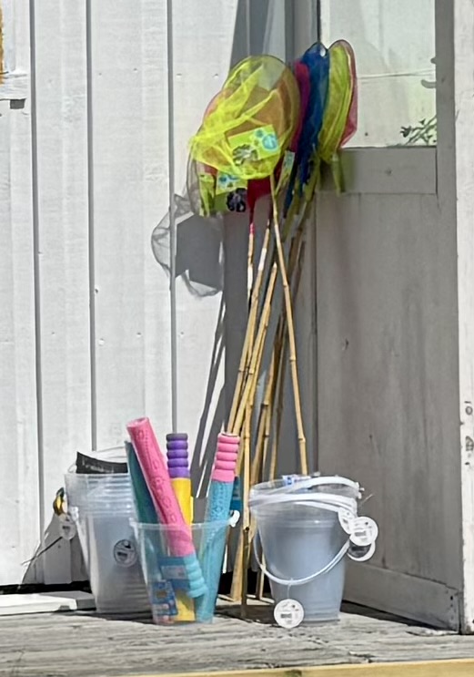 där hund och jag njöt en stund i solen medan vi iakttog alla som också ville gynna den lilla affärsverksamheten och lyssna på vågskvalpet. Ingen fiskade krabbor men om andan skulle falla på, finns utrustning att köpa i sagda kjosk (alltså jag får anstränga mig för att knattra ner den stavningsvarianten, fast visst är det väl lite gulligt?):