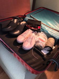Väskan känns väldigt ordentlig; en sådan som välorganiserade personer har. Den har många fack och jag arrangerar alla mina pryttlar och tänker att de skall vara lätta att snabbt fiska upp när jag behöver dem under resans gång.