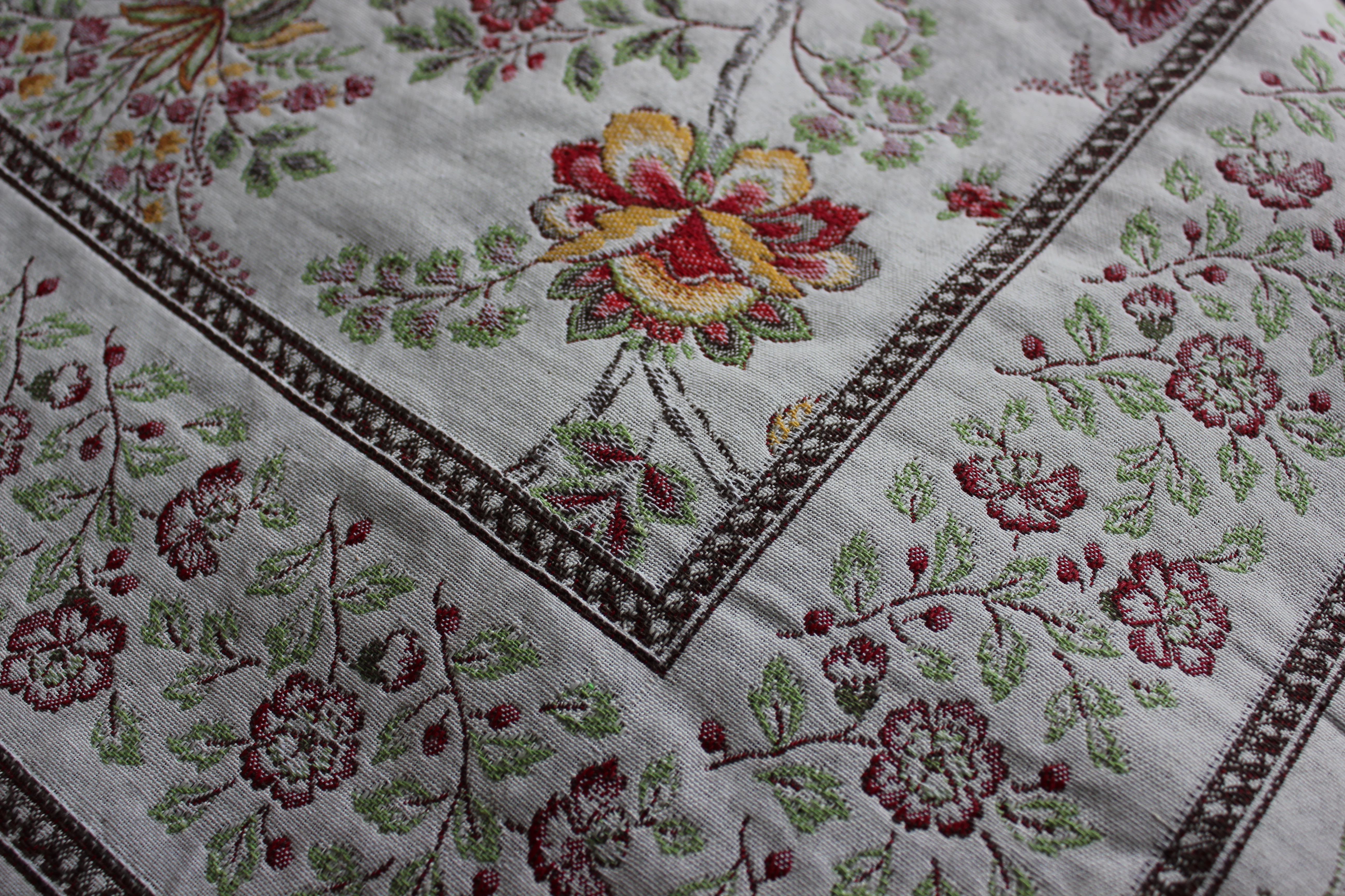 Jag älskar dem! Tjocka, vackra, brokiga men inte alls så där polyestergrälla som sådant kan vara när de dyker upp på platser där turister flockas. En av dukarna, den med tuppar och hönor, har jag sett och nypt i varje gång jag varit i Saint Chinian utan att den fått följa med hem. Idag gick det inte längre. Jag langade fram mina sista kontanter, gjorde damen med dukarna mycket glad och vandrade därifrån, med både tuppduk och presentduk i en triumfatorisk påse i handen.