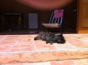 Himlen är blå och dagen är varm nog för att kunna sitta i skuggan. Det har varit en extremt blöt vår här i år och tecknen på det var många när vi kom ner för några dagar sedan. Muren under terrassen hade stora mossbelupna fält där vattnet runnit och även om jag fått bort mossan, kvarstår viss missfärgning.